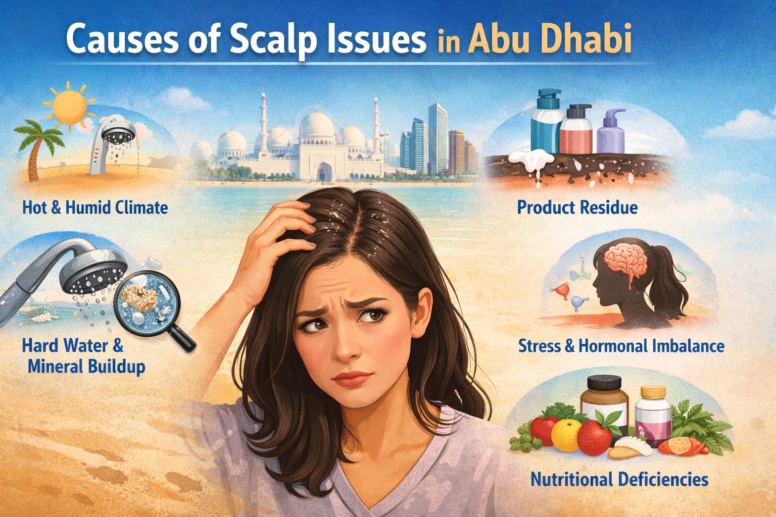 In Abu Dhabi’s climate, factors like heat, humidity, and hard water can disrupt scalp balance, leading to: